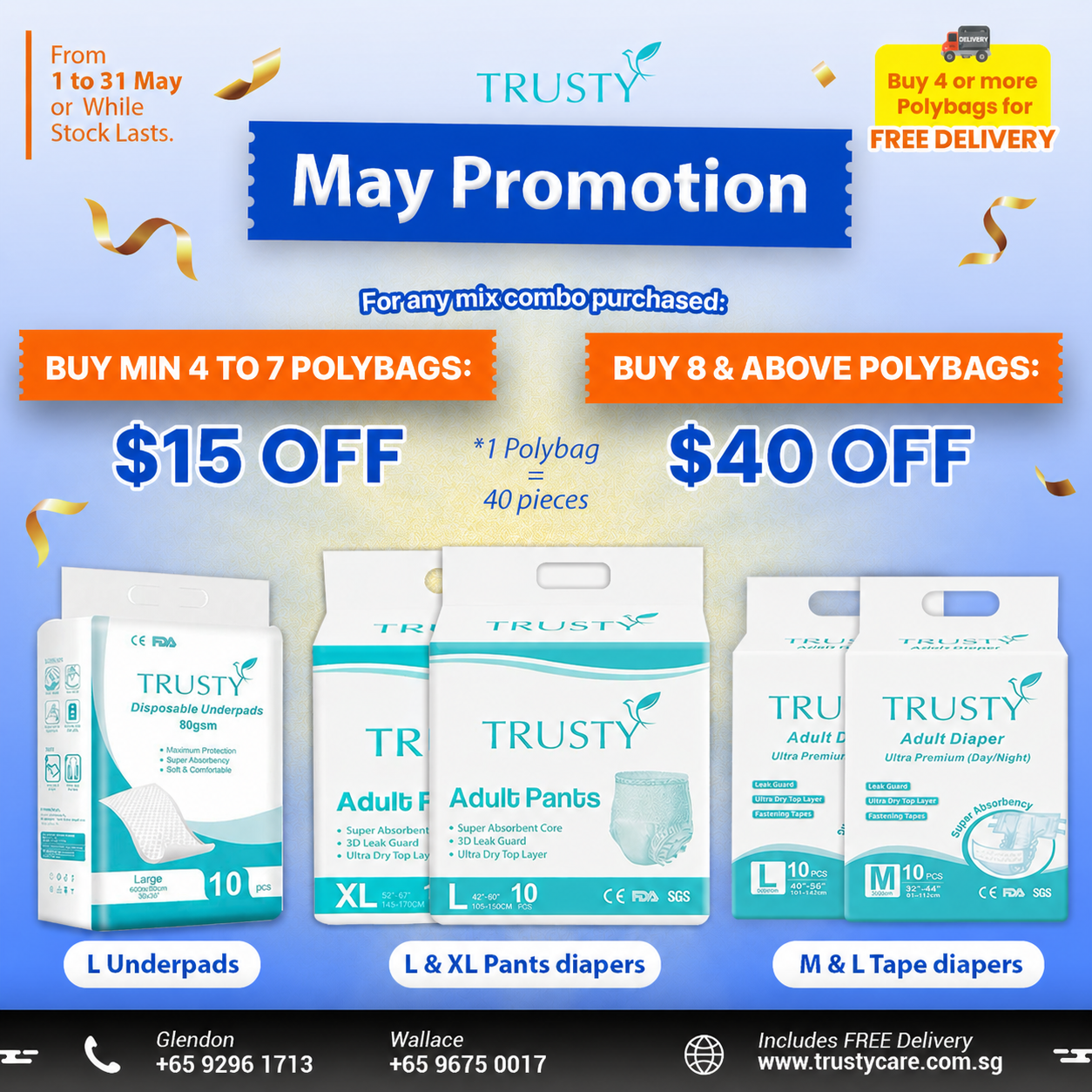 Our adult diapers are brought to you with 5 Star comfort, at up to 25 percent in cost savings! TrustyCare believes in keeping our adult diapers Singapore products affordable for the masses. With regular promotions, enjoy multiple products even with free delivery and gifts. Save more when you purchase multiple polybags of adult diapers, bringing you the best deals and huge savings on the market. Enjoy one of the highest quality, and Cheap Adult diapers in Singapore.